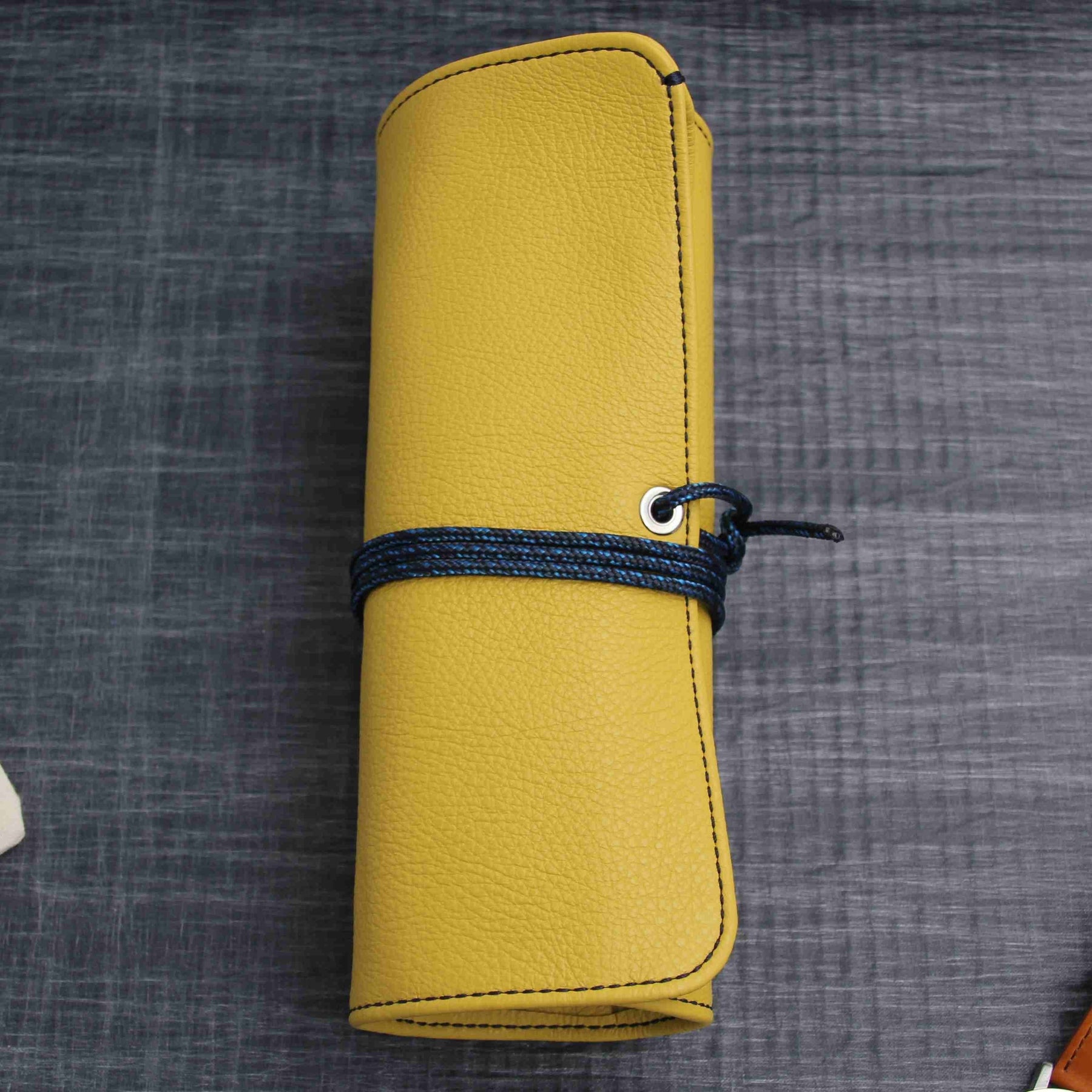 - Couleur jaune, surpiqûres contrastées bleu nuit (autres couleurs disponibles: chocolat et navy)
